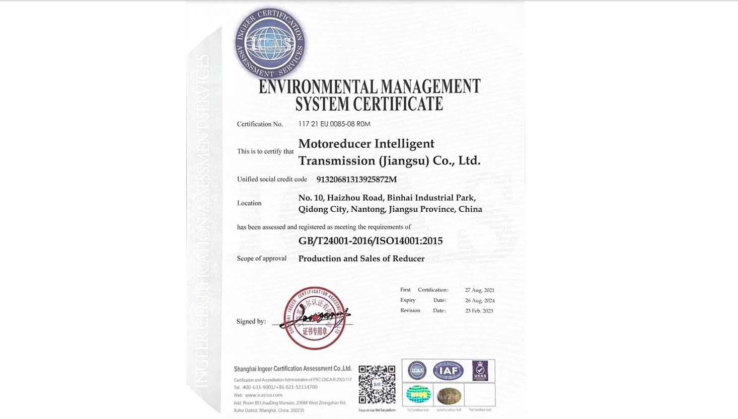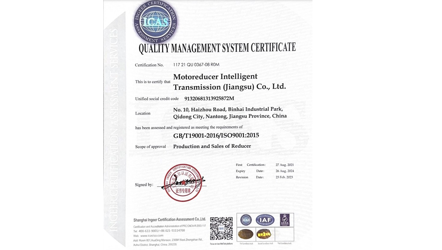 With the growth of the company, the company moved to Qidong new factory in 2020, together with a team of employees with many years of working experience. Now, Motoreducer Intelligent Transmission (Jiangsu) Co., Ltd. Based in Qidong, Jiangsu, China has set up perfect standard production and assembly lines together with suitable quality assurance system